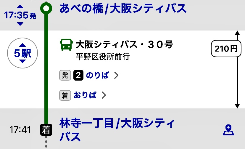 夜の部(18時開演)ならば、大阪シティバス30号、平野区役所前行きに乗って、下車する停留所は