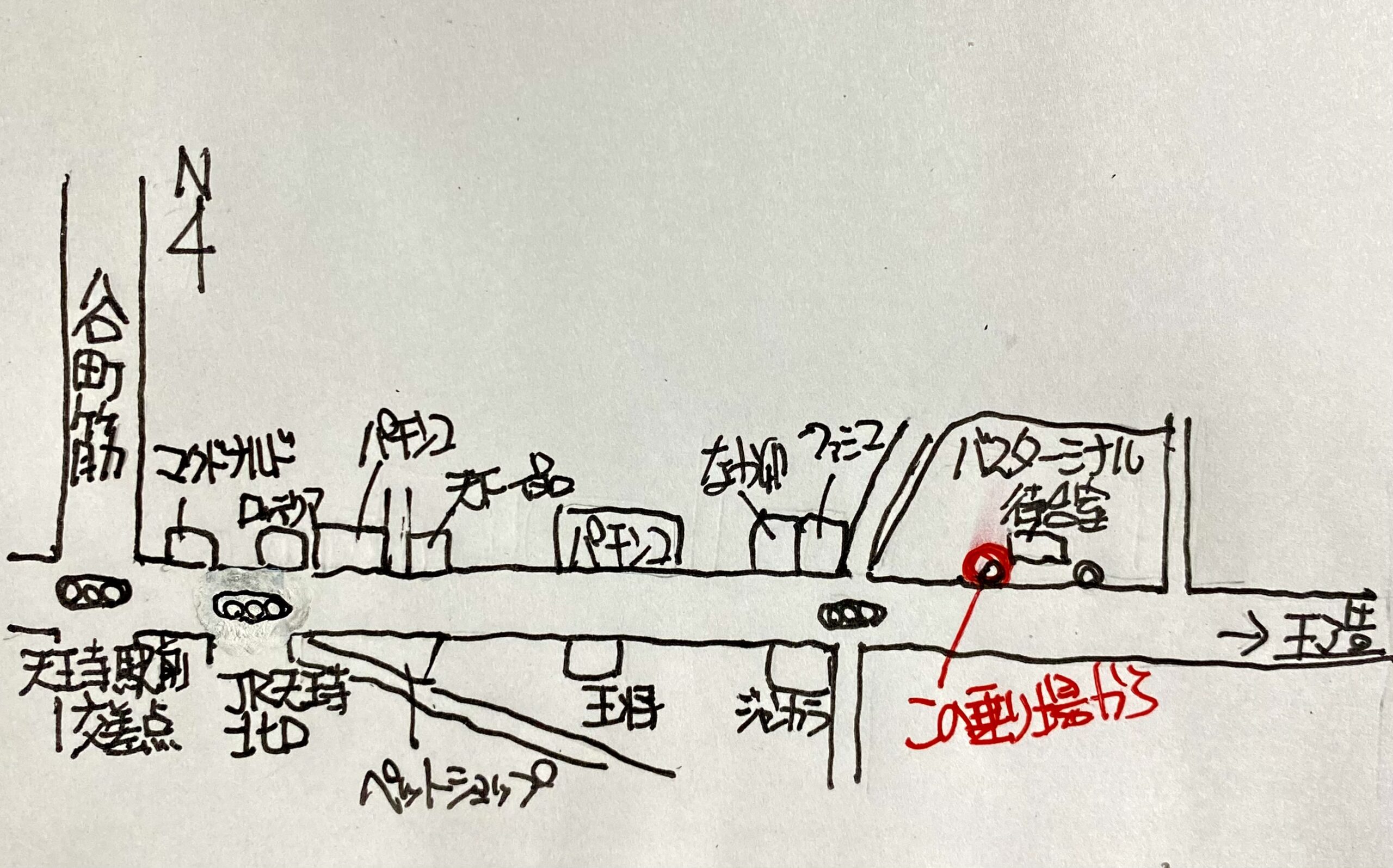 バスターミナルはJR天王寺駅の北口から徒歩3分で、手書きの地図を載せておきます(やはりブログ欄から見てください)